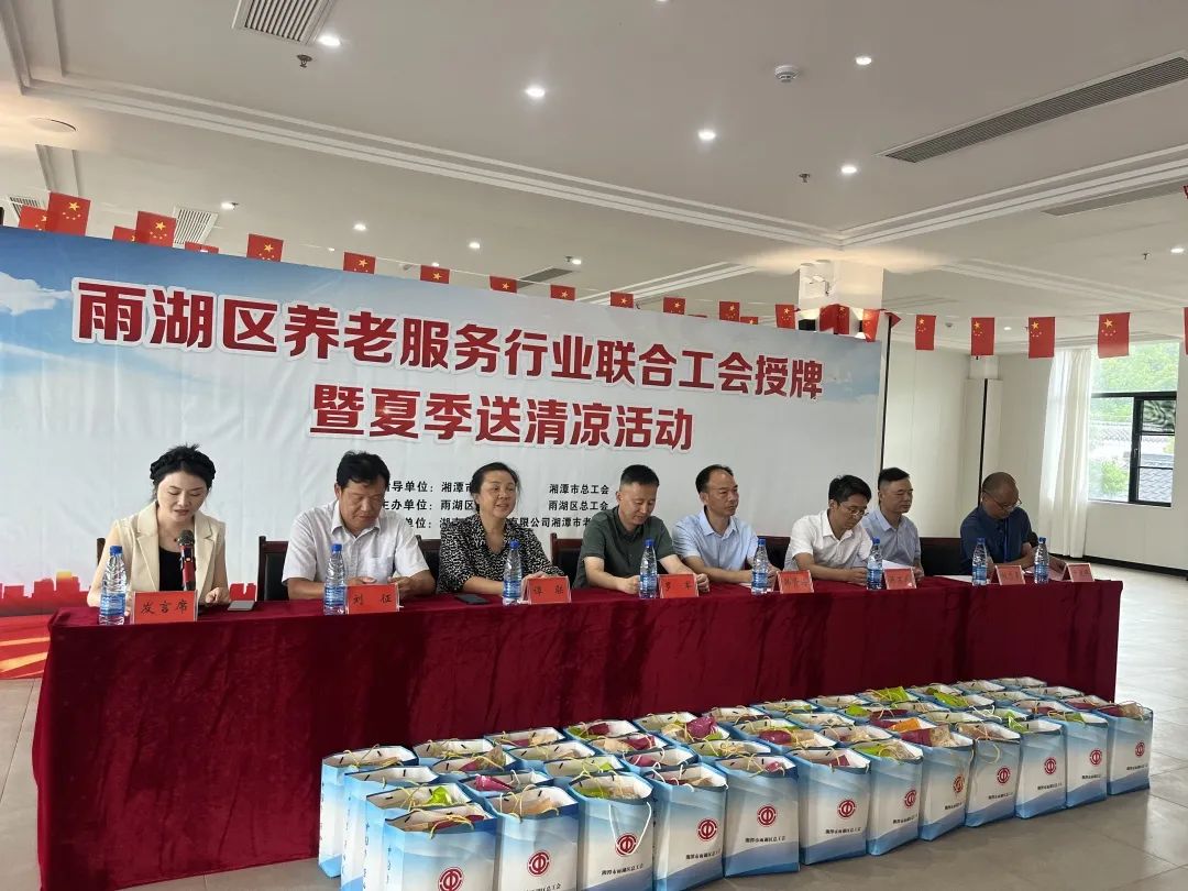 8月23日,雨湖區(qū)養(yǎng)老服務(wù)行業(yè)聯(lián)合工會(huì)授牌儀式暨夏季送清涼活動(dòng)在我院舉行。區(qū)總工會(huì)黨組書記、常務(wù)副主席劉征,人大常委會(huì)副主任、區(qū)總工會(huì)主席譚聯(lián),市總工會(huì)黨組成員、副主席羅軍,湘潭市民政局黨委委員、副局長(zhǎng)韓賢海,雨湖區(qū)委副書記蔣文武,市工會(huì)組織部部長(zhǎng)劉志勇,以及來(lái)自雨湖區(qū)各養(yǎng)老機(jī)構(gòu)的負(fù)責(zé)人代表參會(huì),雨湖區(qū)民政局黨組書記、局長(zhǎng)干建暉主持會(huì)議,華遠(yuǎn)康養(yǎng)中心法人譚燦任首屆工會(huì)主席。
